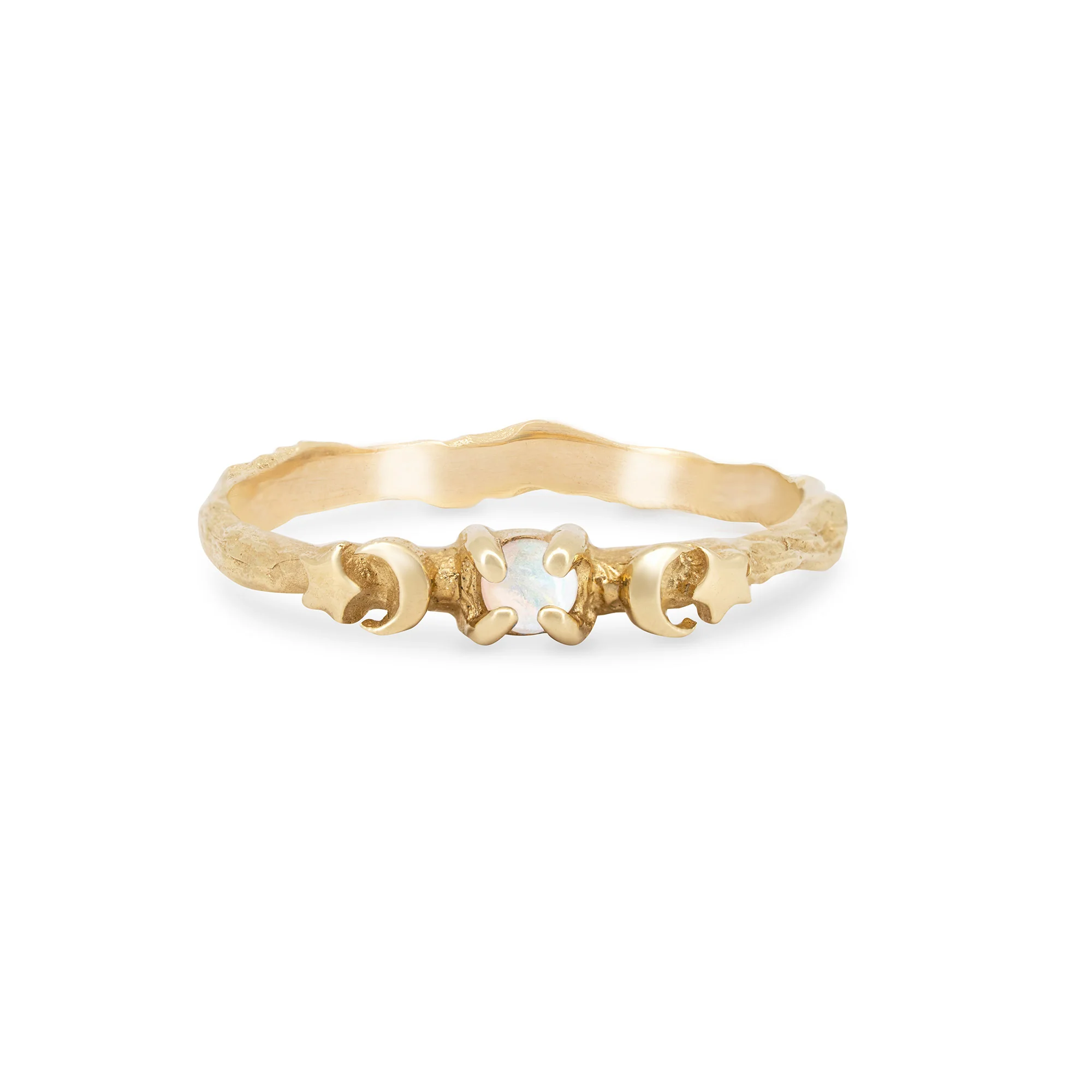Crafted with meticulous attention to detail, the ring is set with a single opal inspired by the sun, featuring dual delicate crescent moons along with two sparkling stars atop a Chupi signature twig ring.